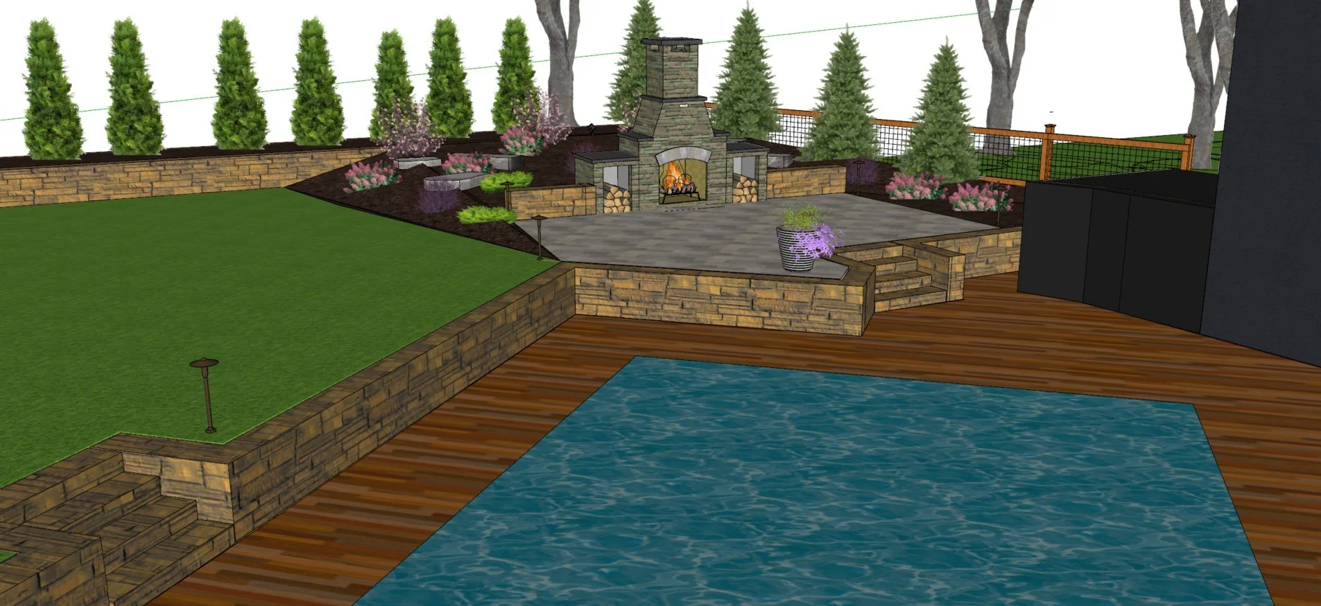 Once the project components and specifications have been decided, a full design (hand drawn, computer generated or virtual tour) can be created which will support the project sales presentation (complete with itemized list of construction components, materials, plants, services and contract). Each project can be molded to a customer's liking with changes, additions or deletions.